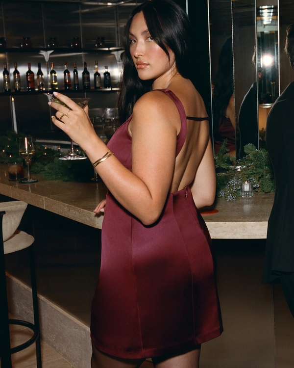 Flattering mini dress in our sculpting stretch-enhanced satin fabric, featuring trendy high-neck detail, flattering open-back detail and a clean skirt. Imported.