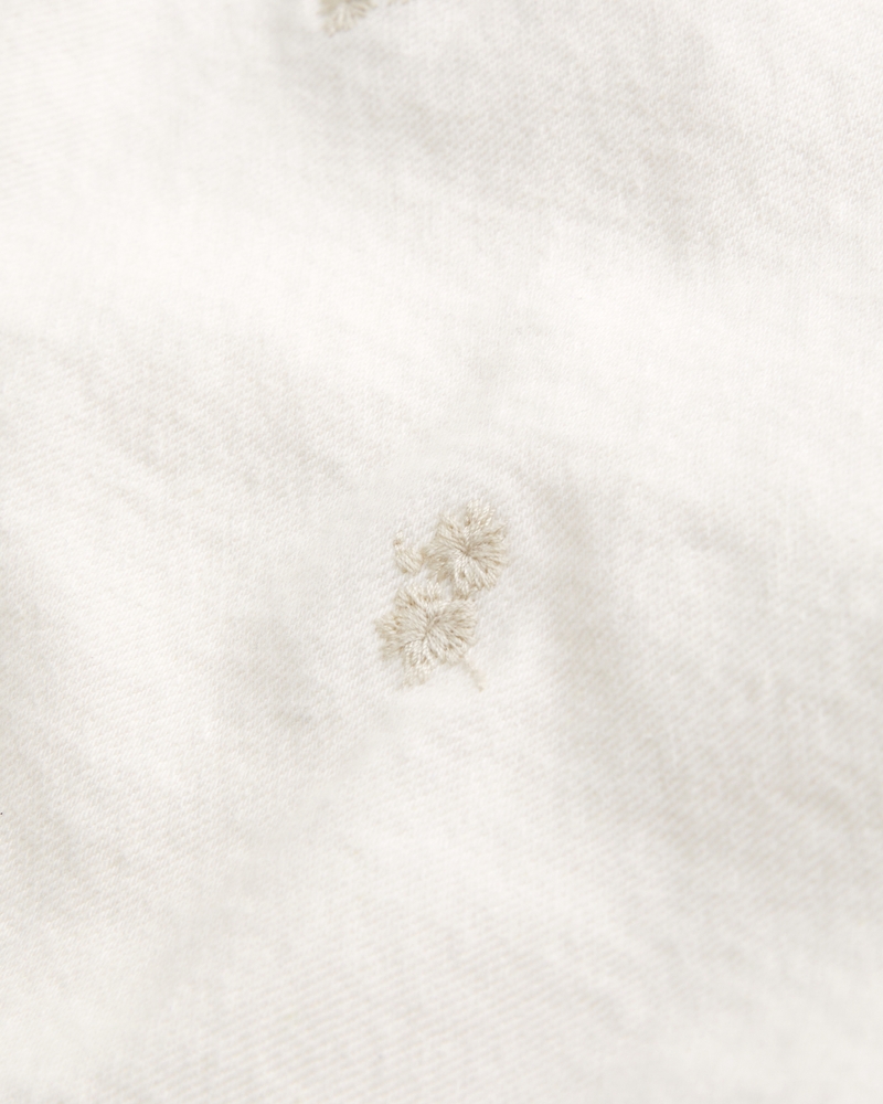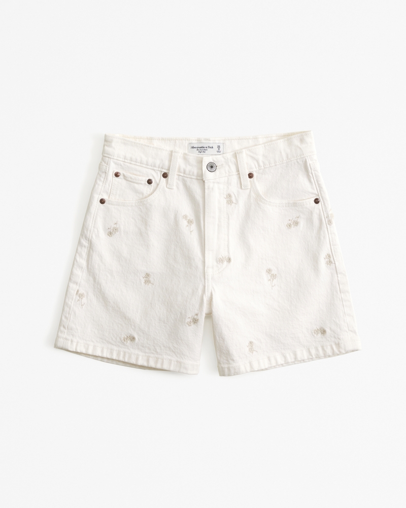 High rise with a relaxed fit throughout the hip and thigh, and a 5 inch (13 cm) inseam. Vintage stretch denim in an ecru wash, with all-over embroidery details and on-trend baby hem. Imported.