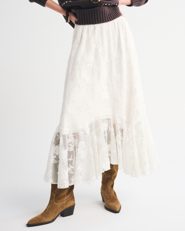 High Rise Embroidered Mesh Flowy Maxi Skirt