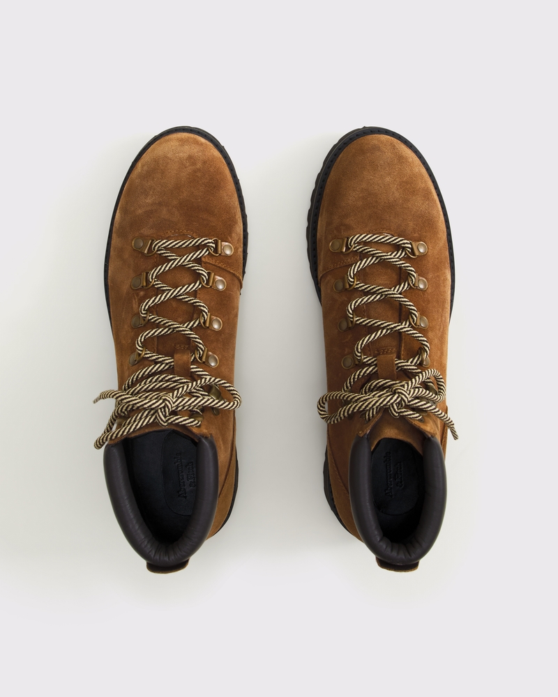 High top hiker boots featuring an elevated design, brown suede finish, rubber lug sole and contrast laces. Imported.