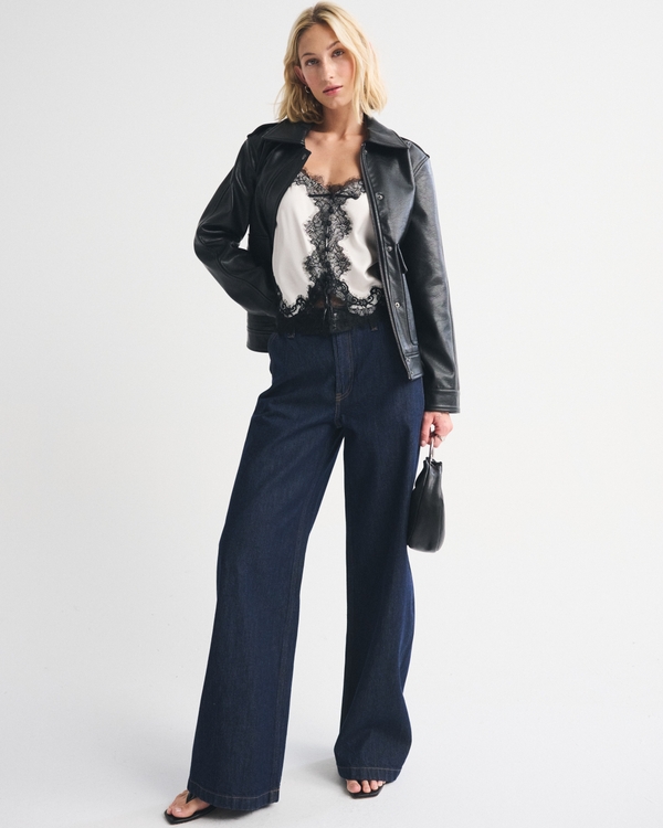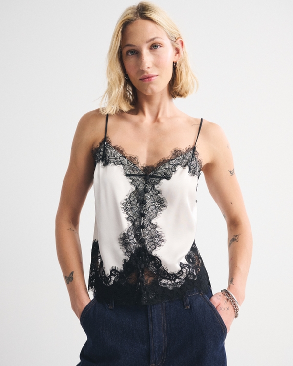 Flirty cami top in our high shine satin fabric and body-skimming silhouette. Features button-through detail, a V-neckline and lace-trim details throughout. Imported.