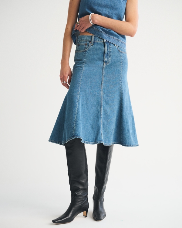 Mid rise midi skirt in our soft linen-blend denim fabric, featuring pockets throughout and front J-stitch zipper for a secure fit. Imported.