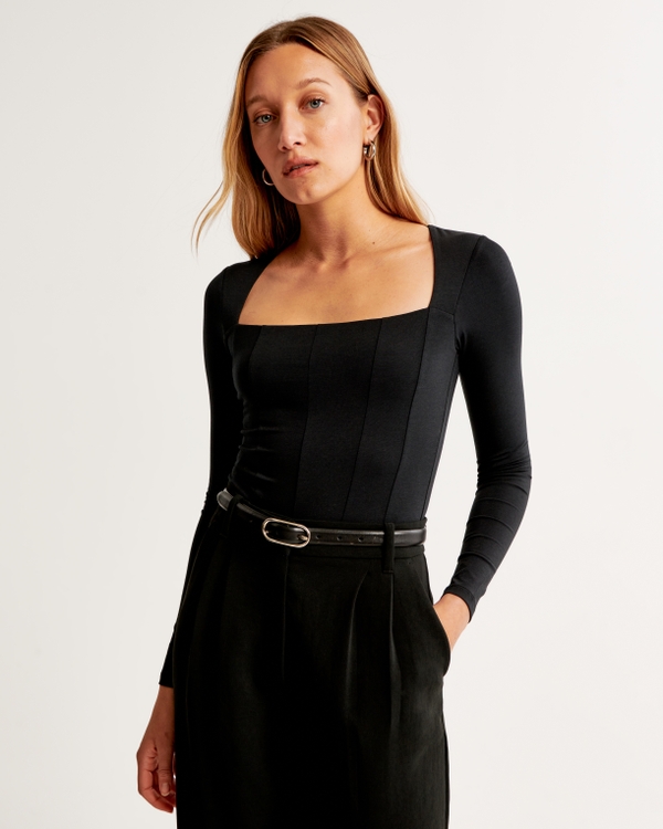Slim-fitting long-sleeve bodysuit in our softAF cotton-modal fabric, with corset-style seaming details along the bodice, square neckline and two-snap bottom closure. Imported.