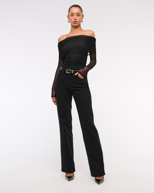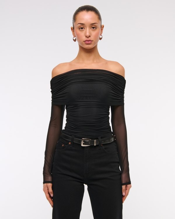 Slim-fitting long-sleeve bodysuit in our soft mesh fabric, featuring off-the-shoulder and foldover details, ruching details along the bodice and two-snap bottom closure. Imported.