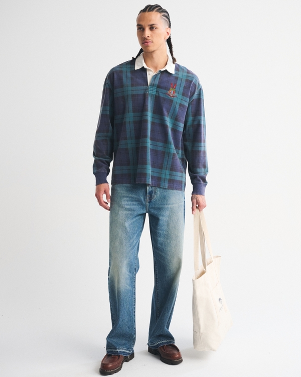 Comfortable long-sleeve rugby polo in our softAF 320g fabric and oversized, drop-shoulder fit. Features an all-over plaid pattern, embroidered graphic detail at the left chest, a classic collar and a three-button placket. Imported.