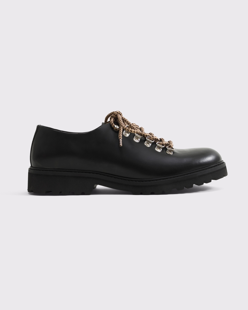 Low top hiker boots featuring an elevated design, black leather finish, rubber lug sole and contrast laces. Imported.
