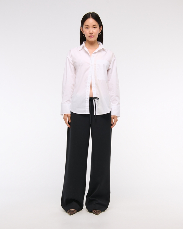 Wide leg pants in our everyday menswear fabric. Features functional pockets with a pull-on style elasticated waistband and a drawstring detail for an adjustable rise. The body of this garment contains 66% recycled polyester. Imported.