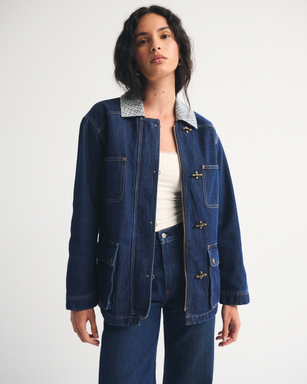 Our mid-length barn jacket in our comfortable denim fabric and relaxed-fit silhouette. Features a flannel fabric interior lining and collar, a zip-up front with clasp closures and pockets throughout. Imported.