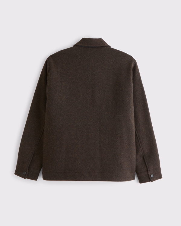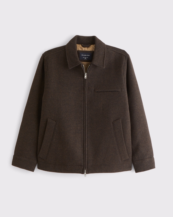 Our new lightweight trucker-style jacket in a cozy wool-blend fabric and mid-length, with a relaxed-fit silhouette. Features side pockets and left chest pocket, classic fold-down collar, zip-up front and lightweight interior lining. Imported.