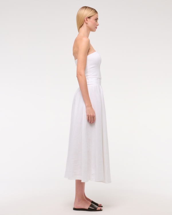 Flattering midi dress in our elevated 100% linen fabric, featuring an on-trend dropped waistline, a functional belt and a volume skirt. Imported.