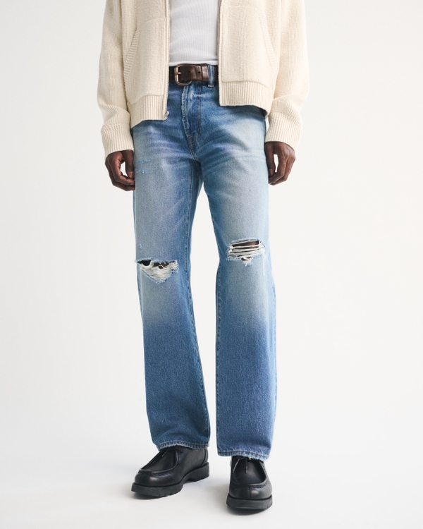 Our relaxed straight fit that is relaxed through the thigh and straight leg with no taper, made in our 100% cotton no-stretch fabric and broken-in denim feel. Features a medium wash, distressed details and clean hem. Imported.