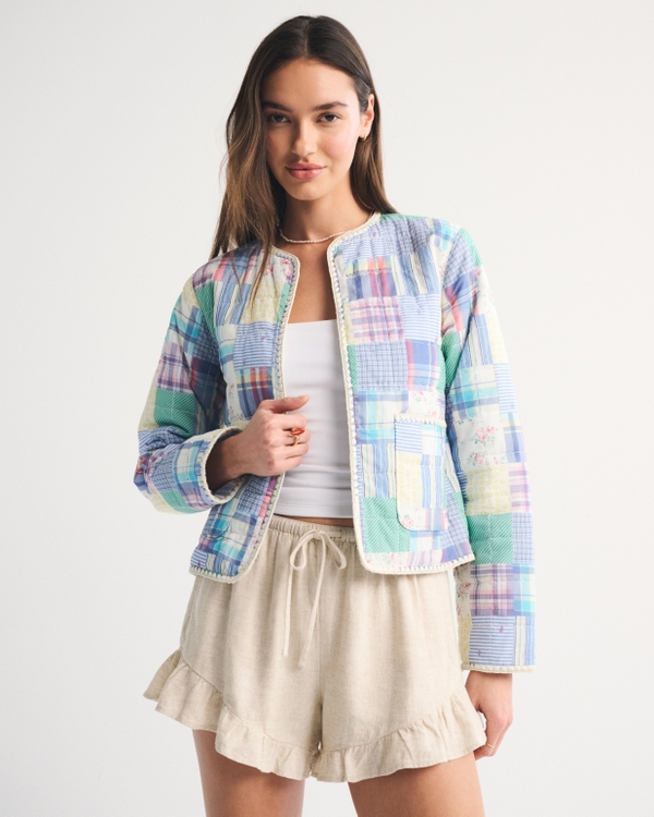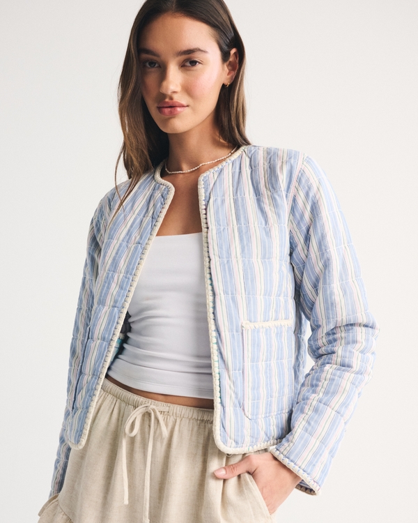 Our comfy jacket in our soft cotton fabric and reversible style, offering two looks in one. Features a non-closure design, blanket stitching details throughout, a collarless neckline, patch pockets and light recycled fill. Imported.