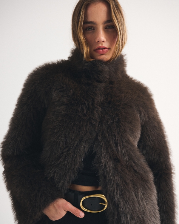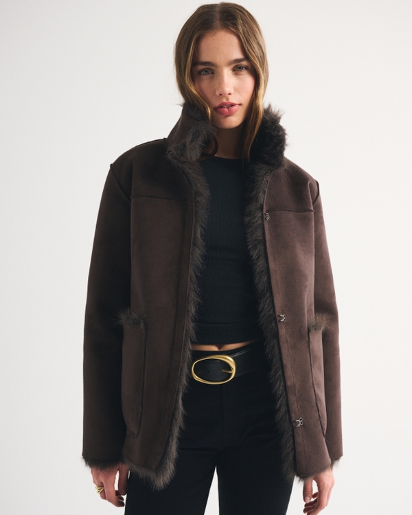 Our new mid-length coat offers two looks in one! This coat is reversible, with a soft faux fur fabric on one side and a vegan suede fabric on the other. Features a mockneck collar, hook and eye closures and patch pockets. Imported.
