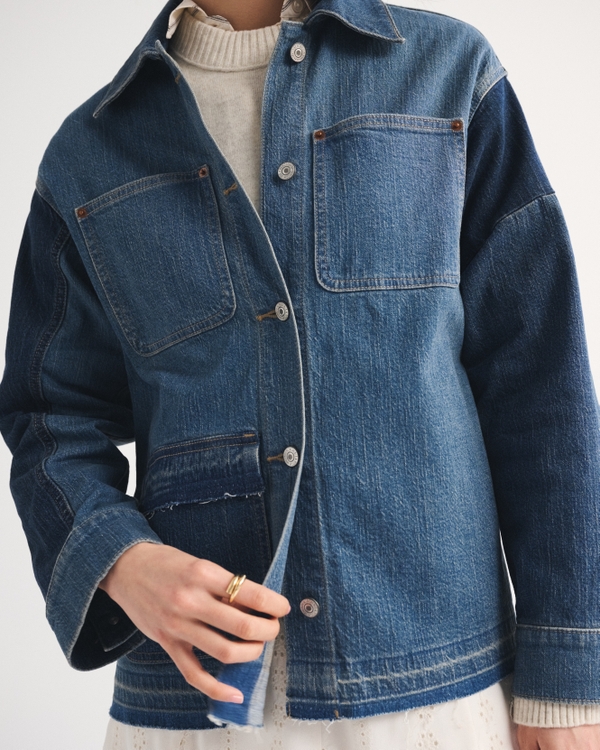 Our comfortable reworked shirt jacket in our linen-blend denim fabric and relaxed-fit silhouette. Features reworked details, front pockets, a classic fold-down collar and a button-up front. Imported.