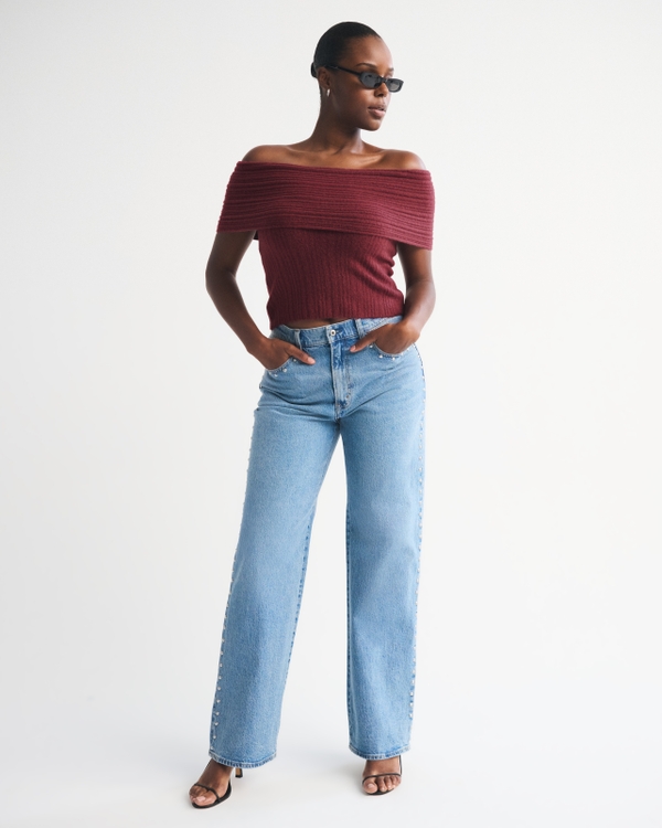 Ribbed Foldover Off-The-Shoulder Sweater Top