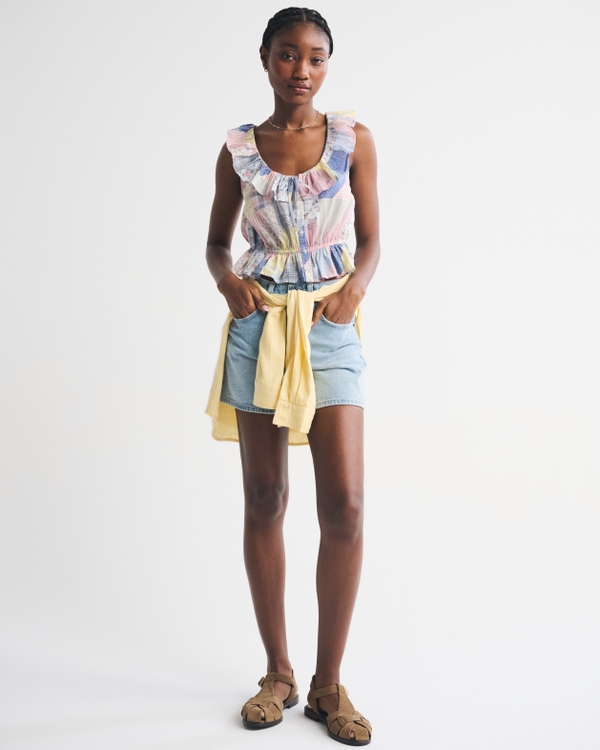Easy-fitting tank in our lightweight cotton fabric. Features ruffle detail along the scoop neckline, button-through detail and a cinched waist detail. Imported.