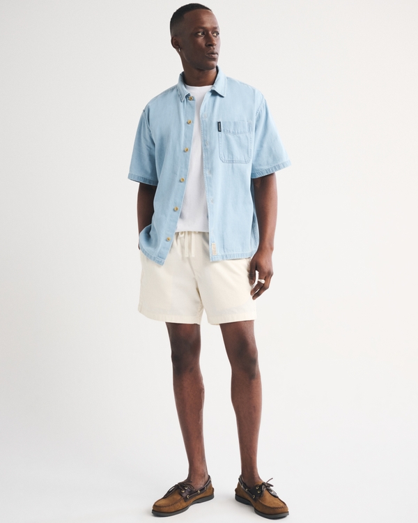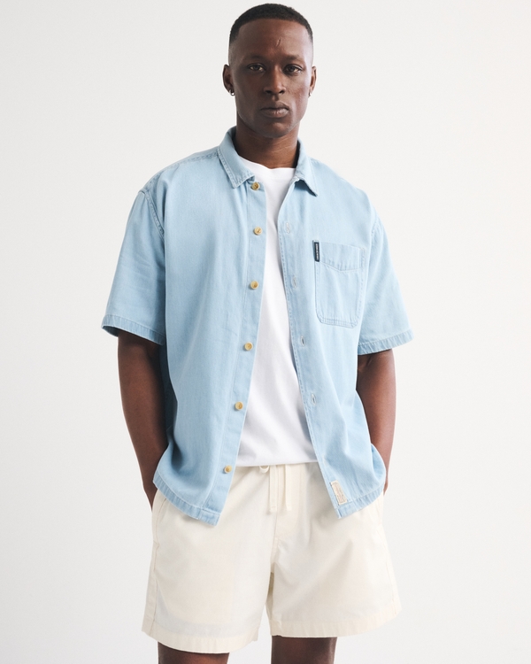 A new collection that celebrates our one hundred year history—inspired by our vintage archives and redesigned for today. This short-sleeve button-up shirt is in a soft denim fabric and oversized-fit silhouette. Features a classic collar and logo tag details at both the left chest pocket and curved hem. Imported.