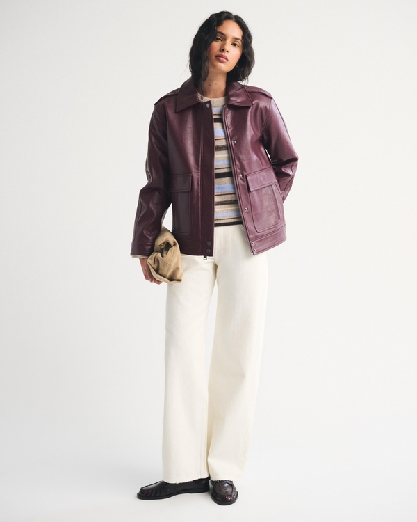 Our comfortable jacket in a relaxed, straight-cut silhouette and our soft vegan leather fabric. Features a classic fold down collar, zip-and-snap up front closure, and front patch pockets with side entry. Imported.
