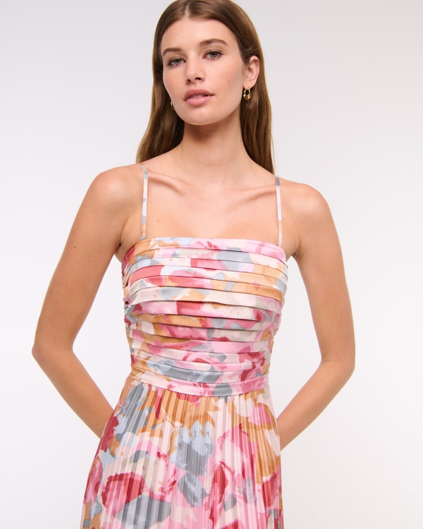 Flattering longer-length maxi dress in our soft satin fabric, featuring a strapless neckline, ruching details along the bodice and a volume pleated skirt. Imported.