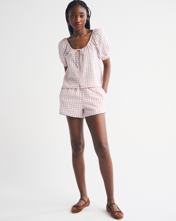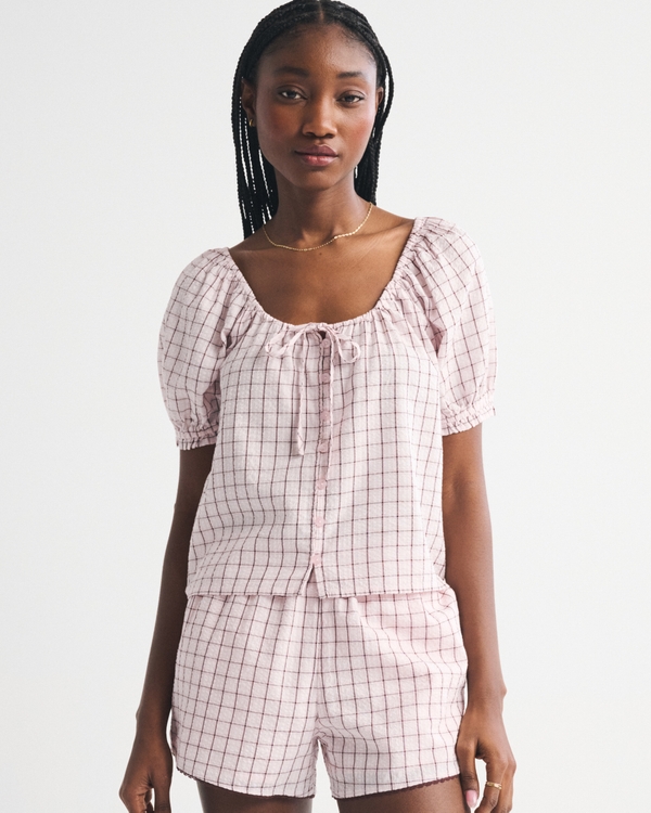 Easy-fitting short-sleeve top in our seersucker fabric. Features a button-through detail, ruched puff sleeves and an adjustable tie-front detail. Imported.
