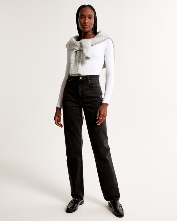 Our classic 90s straight jeans in a black wash, with back thigh slash detail and a clean hem. This fit features an 11.5” ultra high rise, is fitted at top of body and eases through the thigh into a straight leg shape with a full-length inseam. This jean is made from our vintage stretch fabric which features both an authentic vintage look and contains slight built-in stretch for additional comfort. Imported.