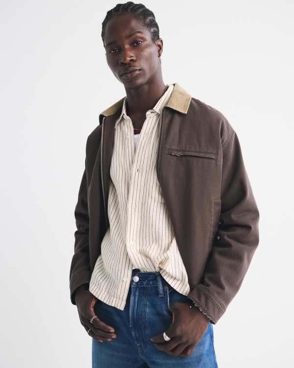 Our new trucker-style jacket in a cozy twill fabric, featuring a relaxed-fit silhouette, side pockets, corduroy fold-down collar, zip-up front and lightweight interior lining. Imported.