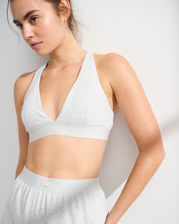 Our lounge bra in our active superSOFT rib fabric and core length. Our superSOFT rib fabric is ribbed and velvety on the outside for a cozy feel with a cooling, smooth interior lining that keeps you comfortable. Features adjustable cross-back straps, removable pads, all-over ribbed detail and a plunging V-neckline. Imported.