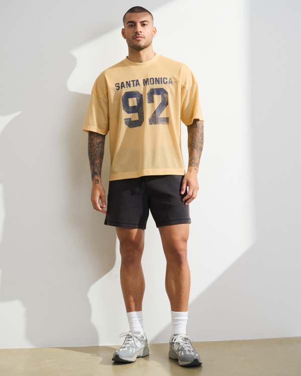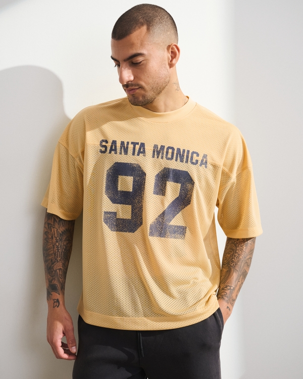 Our easy-fitting short-sleeve active tee in our mesh fabric, that's super soft with an oversized-fit silhouette. Features on-trend graphic detail at chest, shoulder seaming details for extra mobility and a flattering look and crew neckline. Perfect for lifting or casual wear. Imported.